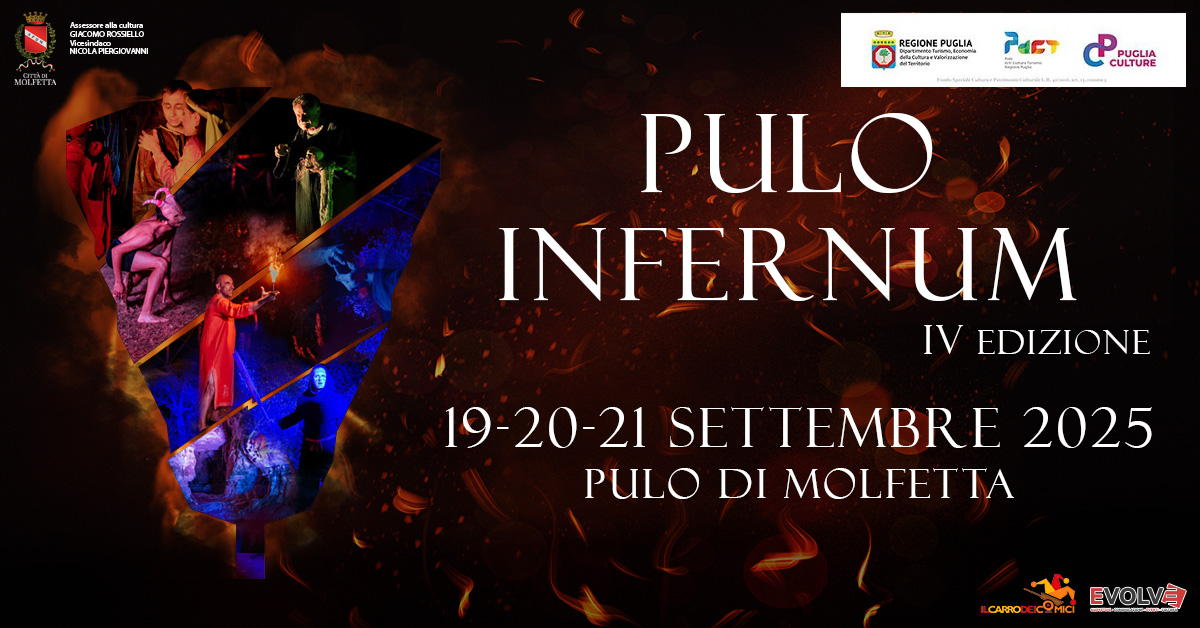 Con il patrocinio del Comune di Molfetta, una proposta culturale inserita nella programmazione 2025 finanziata da Regione Puglia, Fondo speciale cultura, l’idea dell’agenzia di comunicazione ed eventi Evolve di Danilo Sancilio in collaborazione con l’associazione teatrale Il Carro dei Comici, due realtà locali dinamiche ed innovative, dà vita a “Pulo Infernum”, spettacolo giunto ormai alla sua quarta edizione.